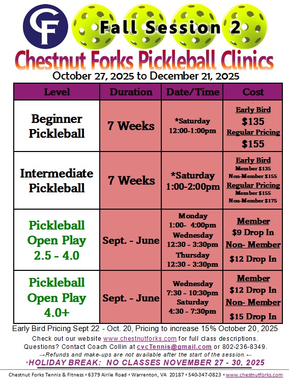 Come out to Chestnut Forks to experience why Pickleball is one of the fastest growing sports in the country! We offer a wide range of programs to meet the growing needs of the pickleball community from the Warrenton and surrounding areas.