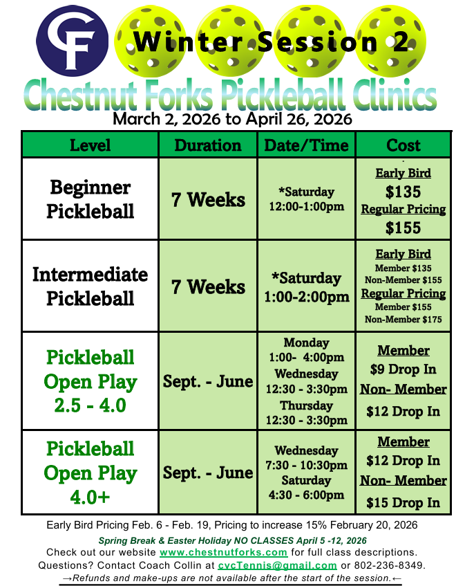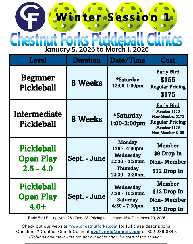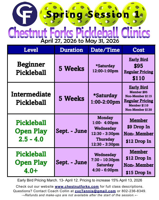 Chestnut Forks offers private lessons, private clinics, introductory clinics for new players, as well as intermediate/advanced clinics for our competitive players. There is also a schedule for open play. Our annual tournaments run throughout the year, so be on the look out for those!